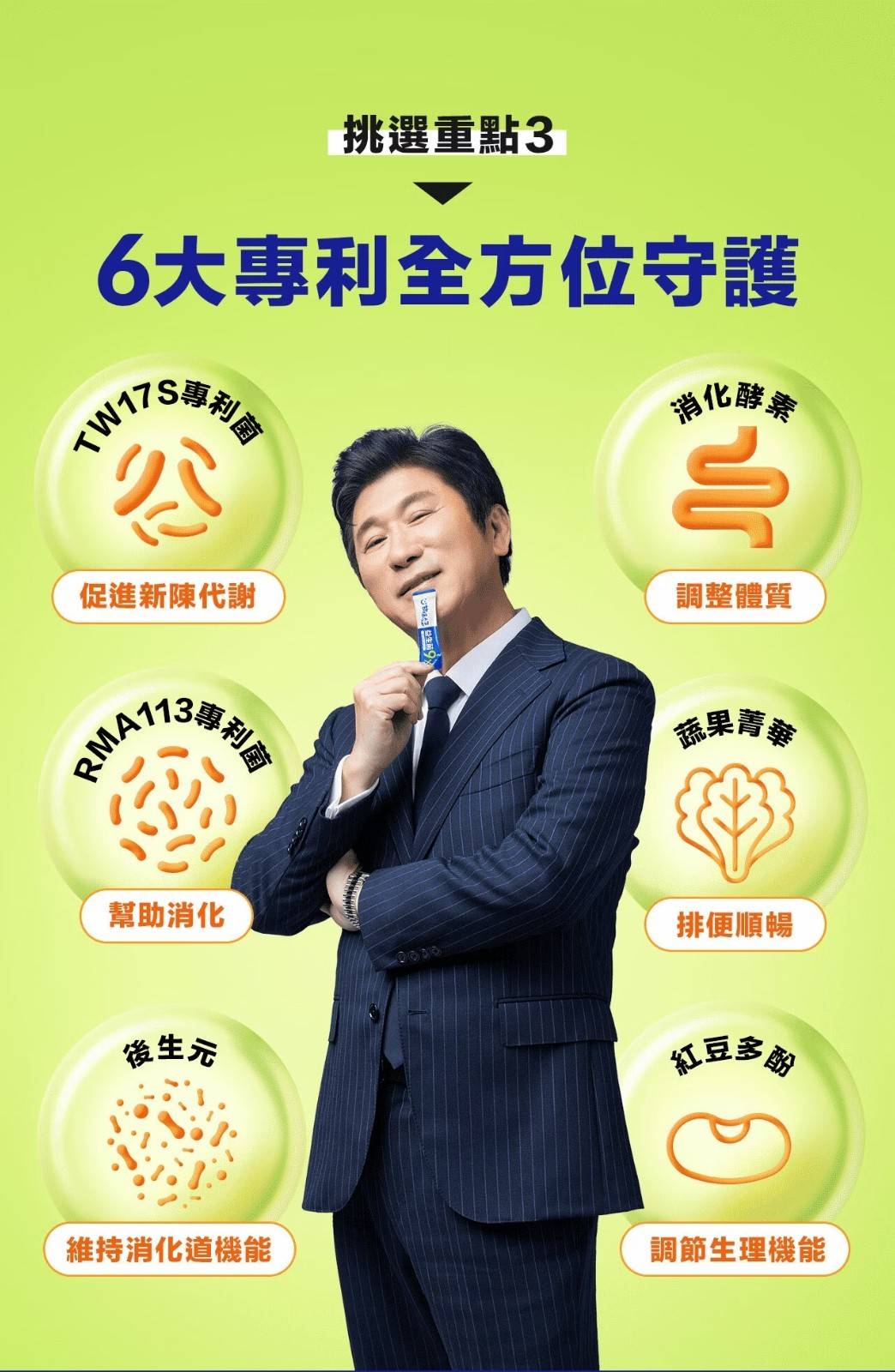 含獨家多國專利益生菌 TW17S 及 RMA113,代謝有感達 170%、保護力達195%,能幫助消化丶排便順暢丶維持消化道機能