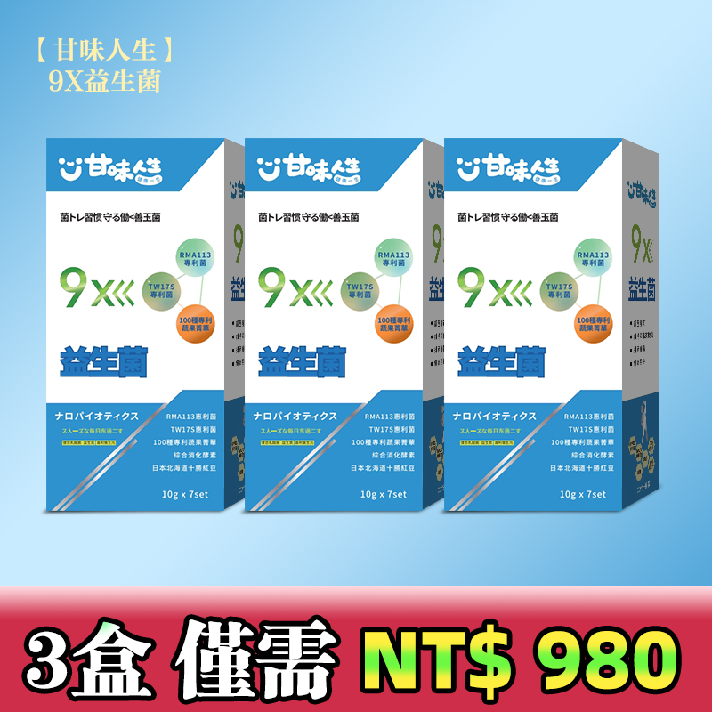 5分鐘前【甘味人生】9X益生菌 - 胡瓜輕鬆甩肉16公斤秘訣大公開 市售唯一次世代益生菌聯盟【益生菌+益生質+後生元】打造新時代益生菌纖瘦健康力 雙專利菌 加專利蔬果菁華 排便順暢 維持消化道機能 綜合消化酵素:幫助消化 燃燒代謝 佰億好菌 全家人都可以吃 9大菌株 6大專利 3大功能面面俱到 越活越青春!【10gx7set】 - 3盒 買二送一【甘味人生】9X益生菌 【限量99组】暴瘦4-6公斤!!-僅需 NT$980 【99%选择!!】