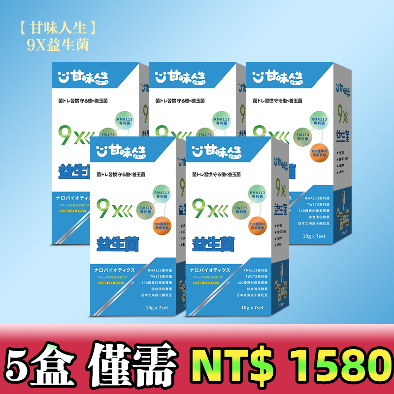 5分鐘前【甘味人生】9X益生菌 - 胡瓜輕鬆甩肉16公斤秘訣大公開 市售唯一次世代益生菌聯盟【益生菌+益生質+後生元】打造新時代益生菌纖瘦健康力 雙專利菌 加專利蔬果菁華 排便順暢 維持消化道機能 綜合消化酵素:幫助消化 燃燒代謝 佰億好菌 全家人都可以吃 9大菌株 6大專利 3大功能面面俱到 越活越青春!【10gx7set】 - 5盒 買四送一【甘味人生】9X益生菌 【限量199組】暴瘦8-12公斤!!-僅需 NT$1580